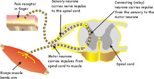 Describe the structure and functioning of a simple reflex arc illustrated by the withdrawalof a finger from a hot object
